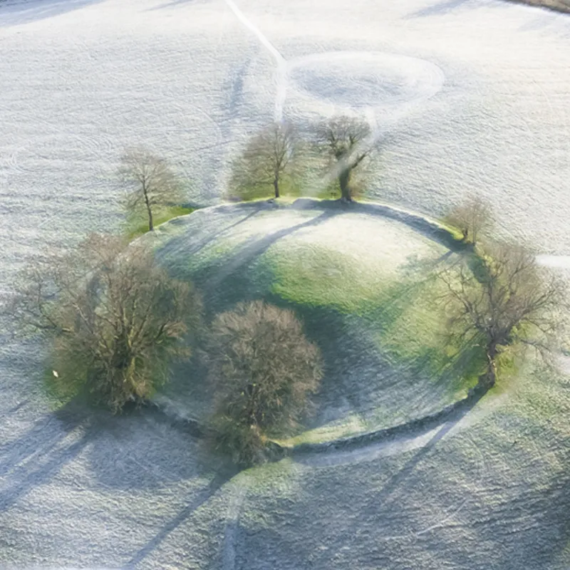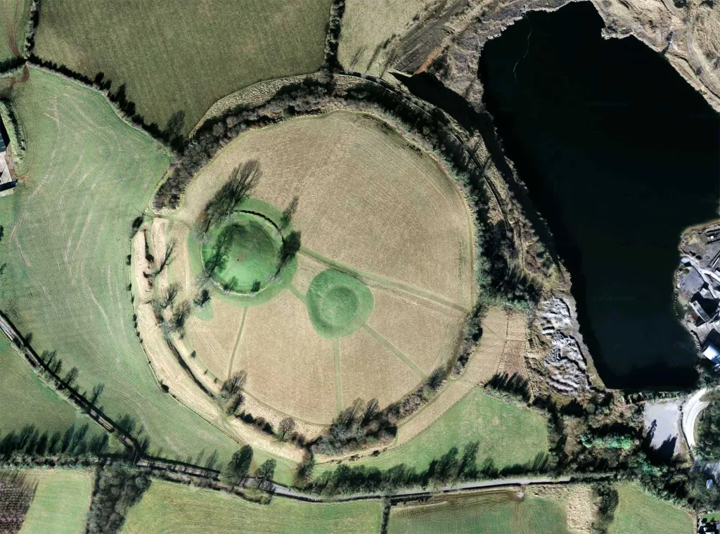 The hilltop is encircled by a substantial ditch and outer bank forming a ceremonial enclosure. This was constructed about 100BC. About the same time a large mound was constructed on top of the hill. Excavations here found a timber structure 40m in diameter comprised of 5 rings of large oak posts, some 280 altogether. At the centre was a very large post, some of the wood of which survived and was dated to 95BC. Shortly after, while the structure was still standing, a cairn of boulders was constructed within it. The timber building was then burned deliberately, and the surviving cairn was capped by the mound of turves that can be seen today.