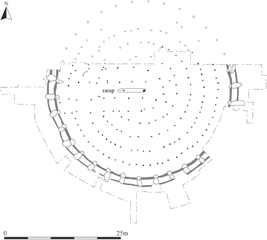 Around 95BC the massive enclosing bank and internal ditch were constructed along with a huge timber building, 40m in diameter on site B. Soon afterwards this structure was filled with limestone boulders, deliberately burnt down and mounded over. This dramatic act likely marked a powerful ritual event and the artificial mound at Site B is understood to be a carefully constructed ceremonial platform built with layered soil, turf, and stone